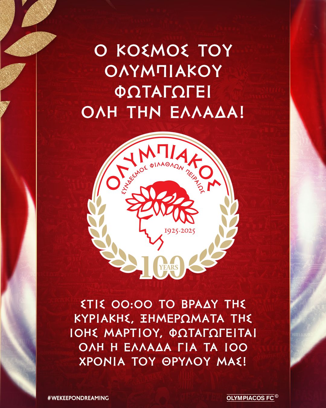 Ο Ολυμπιακός θέλει να κάνει αξέχαστη την επέτειο για τη συμπλήρωση 100 χρόνων ζωής. Έτσι, έστειλε στους φιλάθλους του το μήνυμα να φωταγωγήσουν ολόκληρη την Ελλάδα.