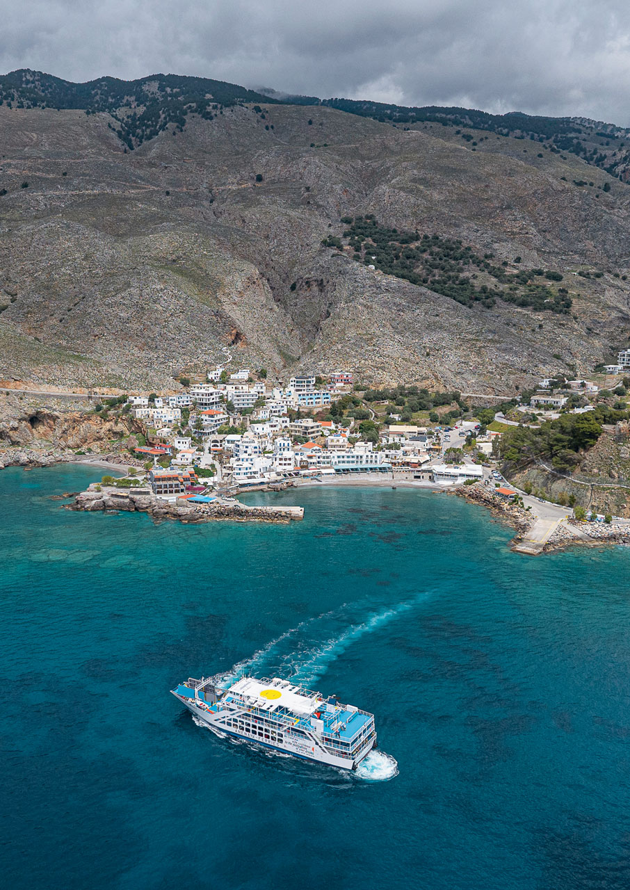 Φροντίζει γι’ αυτό η ΑΝΕΝΔΥΚ, η πολυμετοχική εταιρεία λαϊκής βάσης που με τα πλοία «Δασκαλογιάννης» (Χώρα – Λουτρό – Αγία Ρουμέλη – Σούγια – Παλαιόχωρα) και «Σαμαριά» (επιδοτούμενο, που συνδέει τη Γαύδο με τη γραμμή) στοχεύει στη στήριξη της περιοχής. «Θέλουμε να κρατήσουμε τους ντόπιους και τους νέους στα Σφακιά, να φέρνουμε επισκέπτες, να νιώθουν οι άνθρωποι ότι έχουν λόγο να μείνουν σε αυτόν τον τόσο προνομιούχο τόπο», μας λέει ο Στράτος Μπουρνάζος, καπετάνιος και πρόεδρος της εταιρείας, με καταγωγή από τον Αποκόρωνα, που ήρθε στα Σφακιά ως γαμπρός το 1986.